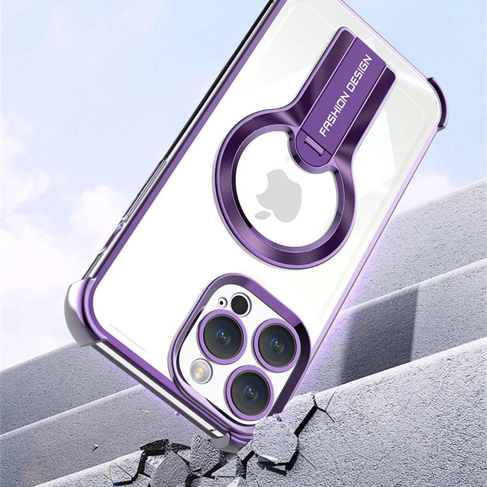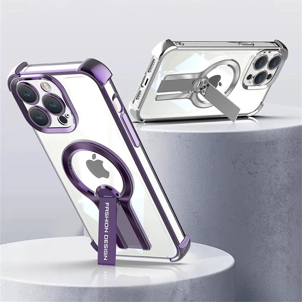 Luxury Transparent Magnetic Armor iPhone Case with Hidden Folding Stand β Shockproof Back Cover for iPhone 11 to 16 Pro Max